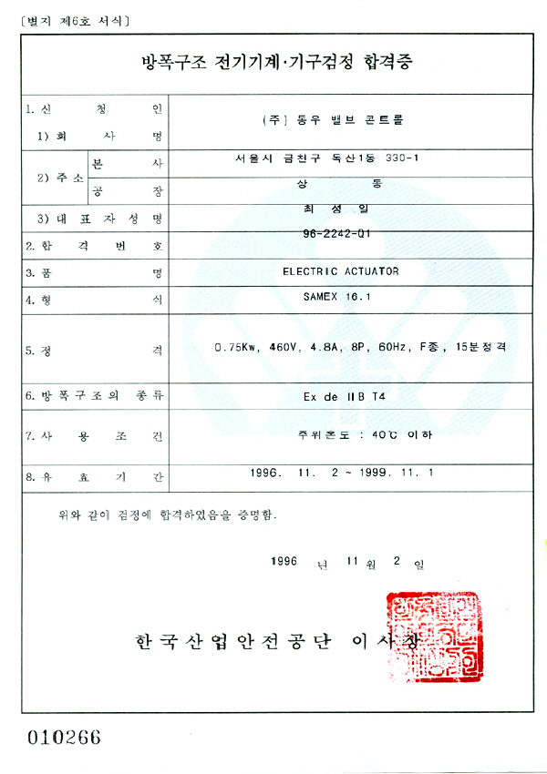 방폭구조 전기기계∙기구검정 합격증 SAMEX 16.1