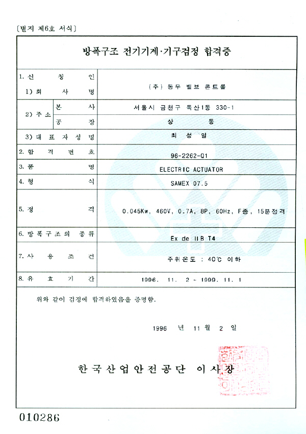 방폭구조 전기기계∙기구검정 합격증 SAMEX 07.5