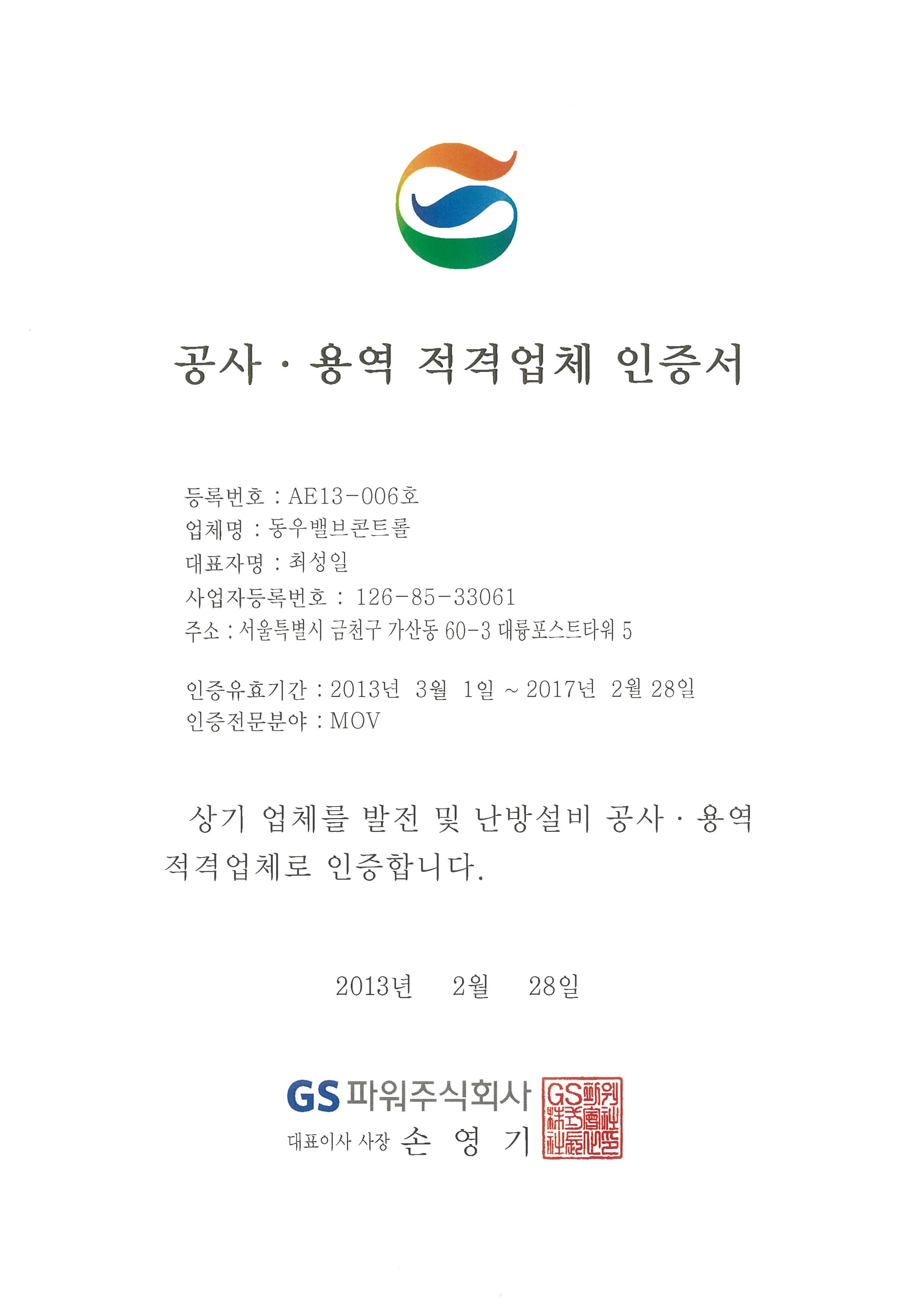 발전 및 난방설비 공사·용역 적격업체 인증서 (MOV)