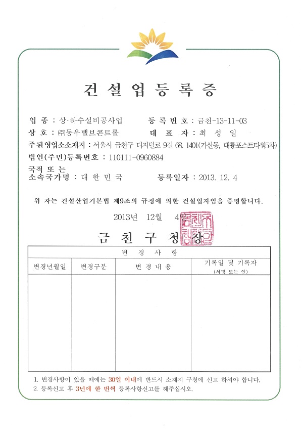 상·하수 설비공사업 건설업 등록증