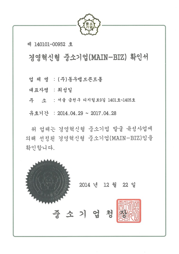 경영혁신형 중소기업(메인비즈) 확인서 by 중소기업청